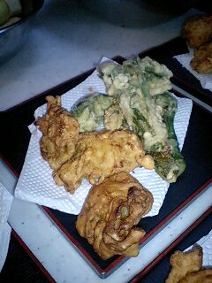 タラの芽とウド、細竹とそら豆とかに身のかき揚げ。
