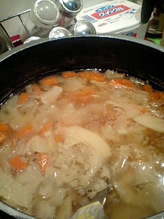 お汁は人参タマネギ豚肉大根こんにゃくそれにタケノコを+。